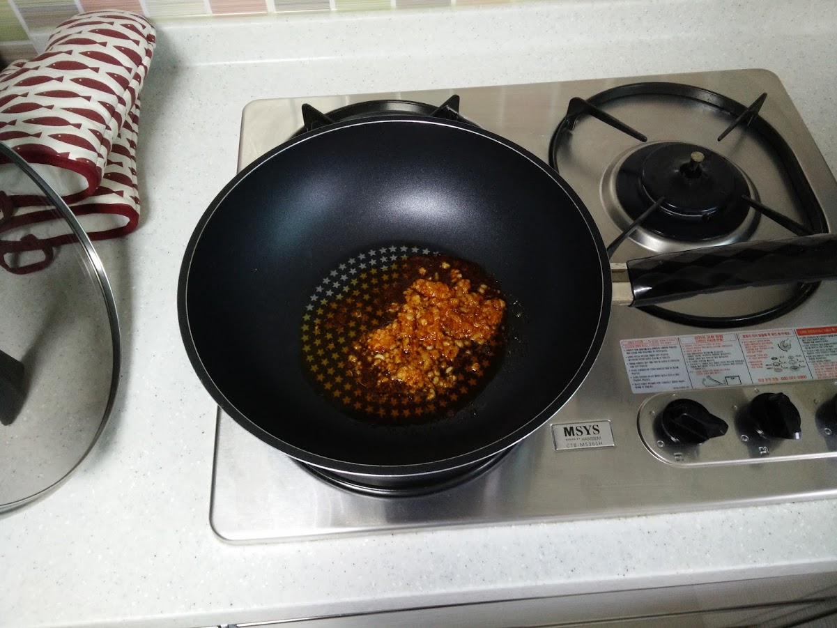 이 고추기름으로 다진마늘을 먼저 볶습니다[/caption]