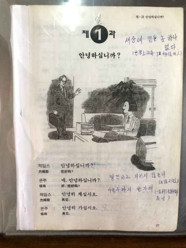 What makes this seemingly ordinary piece of a Korean learner's book is the scribbles at the edge of the page: