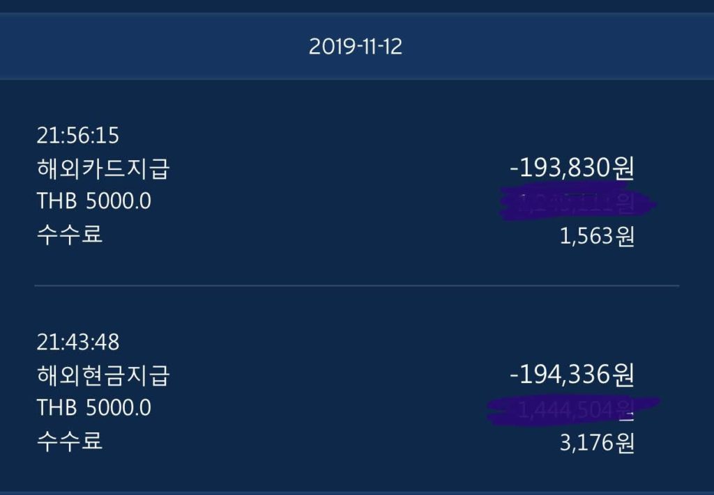 그리고 정말 궁금해서 방콕에서 동일한 금액을 동일 시간대에 인출해봤다. 좀 이상한 결과가 나왔다.