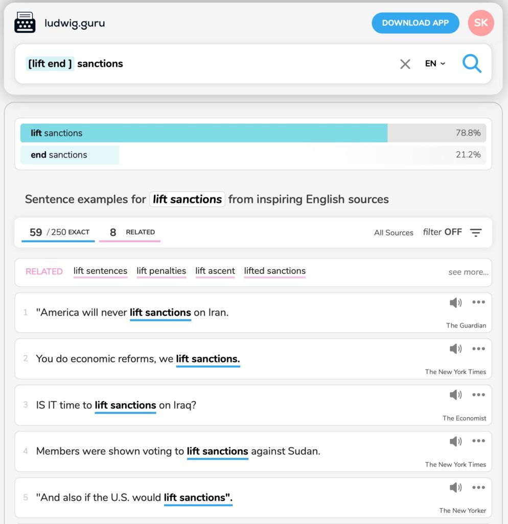 앞서 언급한 '제재'의 경우 제재를 '해제'한다는 표현은 물론 lift를 많이 쓰지만 만약에 end를 쓰는 경우와 비교하면 어떨까? 루트비히에서는 그 빈도를 퍼센티지로 비교하는 게 가능하다.