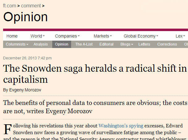 늘 관심 갖고 지켜보고 있는 기술철학자인 예프게니 모로조프가 오늘자 파이낸셜 타임즈에 기고한 글은 바로 스노든 폭로 사건에 대한 것이다. 다들 아시다시피 스노든의 폭로 사건은 지금까지도 전문가들과 코멘테이터들 사이에서 여전한 논쟁의 대상이다. 논쟁의 대부분은 국가 안보를 위한 정보 수집행위가 어디까지 정당한가, 그리고 이로 인한 개인 인권 보호를 위해서는 어떠한 법적 구속이 필요한가 등에 할애되고 있는데, 모로조프는 보다 넓은 안목에서 사건을 바라볼 것을 주문한다: